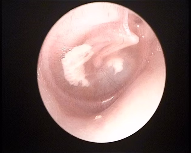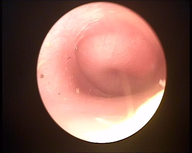 Niveles líquidos amarillentos y placas de timpanoesclerosis (manchas blancas) producidas por otitits de repetición.