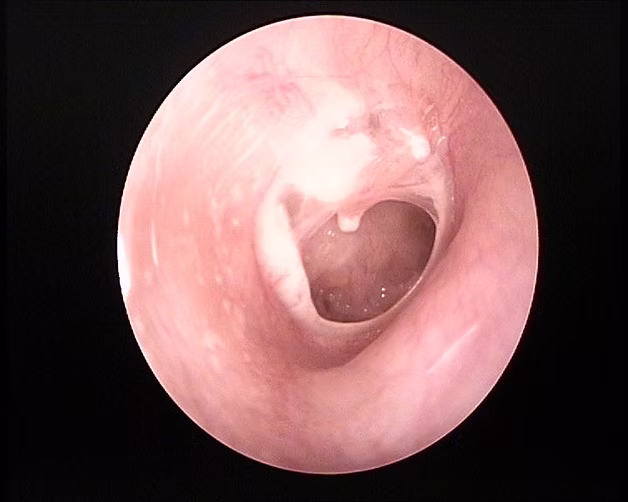 Miringoplastia. Se observa perforación timpánica cerrada, buena epitelización y angulación.